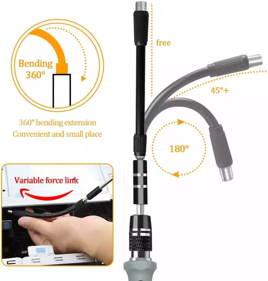 Tukaj je tudi dodaten gibljivi podaljšek do 60 mm, nastavljive dolžine, in gibljiva mehka gred za dosego vijakov na težko dostopnih mestih, idealno za stereo delo. Set je opremljen tudi z antistatično pinceto in silikonskimi nedrsečimi ročaji za vse priložnosti. 🔧🔍