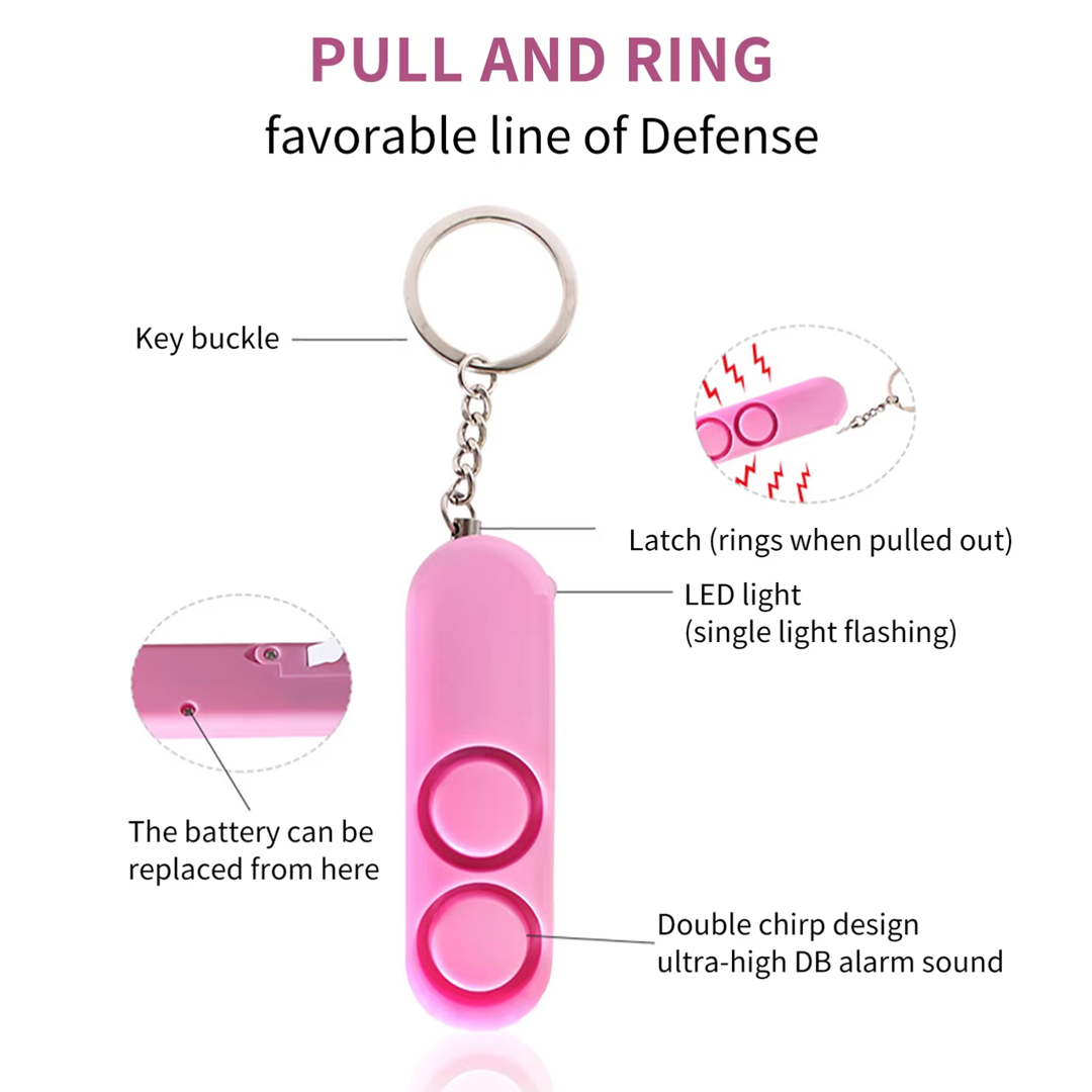 - Enostaven za uporabo. V nujnih primerih se zgornji obesek lahko potegne ven, osebni alarm pa oddaja zvok ultra visoke jakosti 130 dB. Obesek se lahko vtakne nazaj, da se alarm izključi.