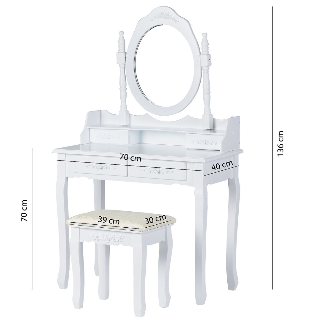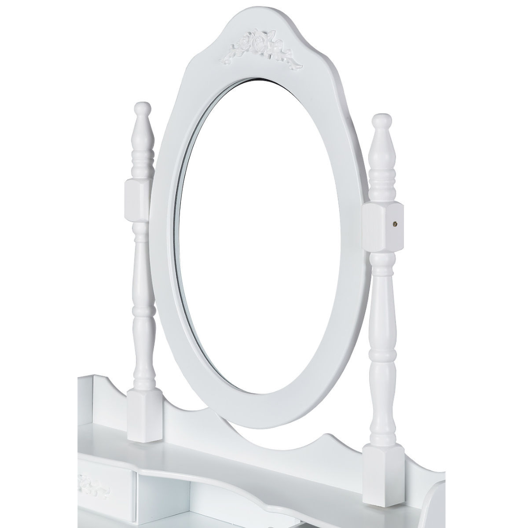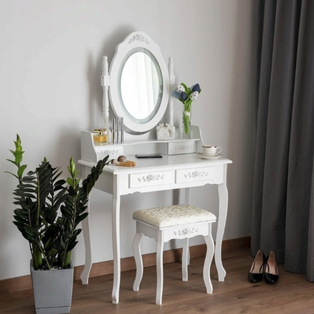Elegantna bela miza z ogledalom, udobnim stolom in praktično shrambo za vsak kotiček vašega doma.