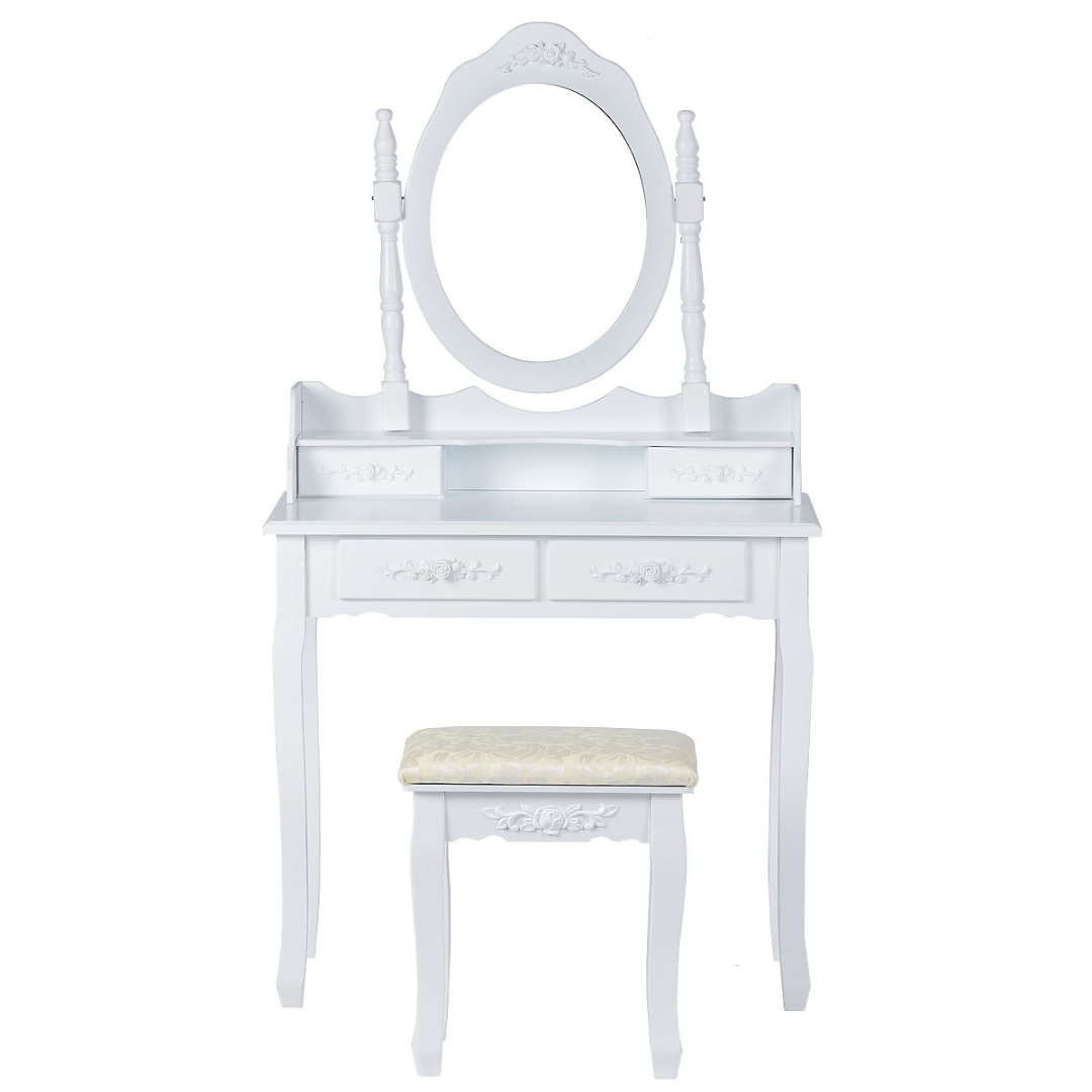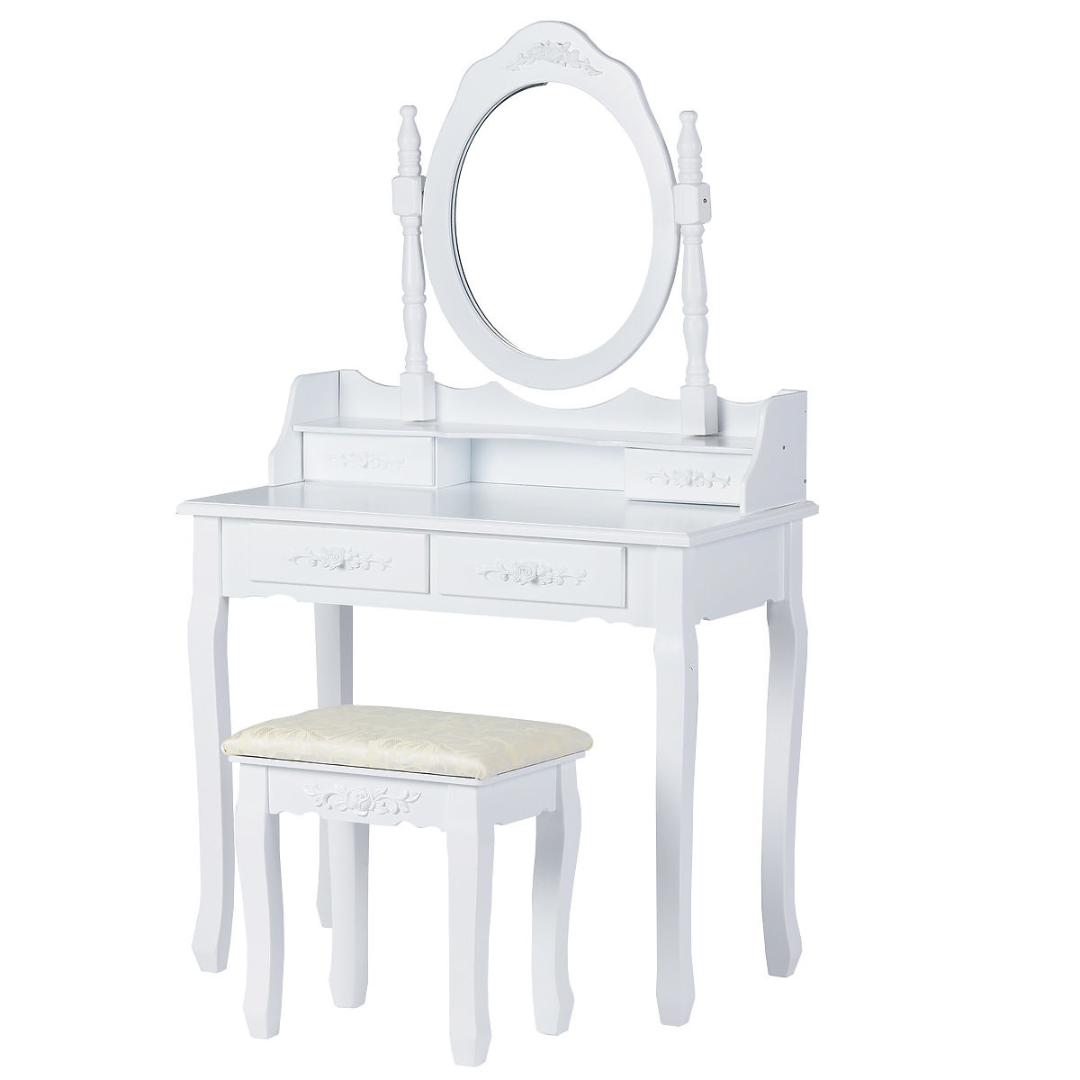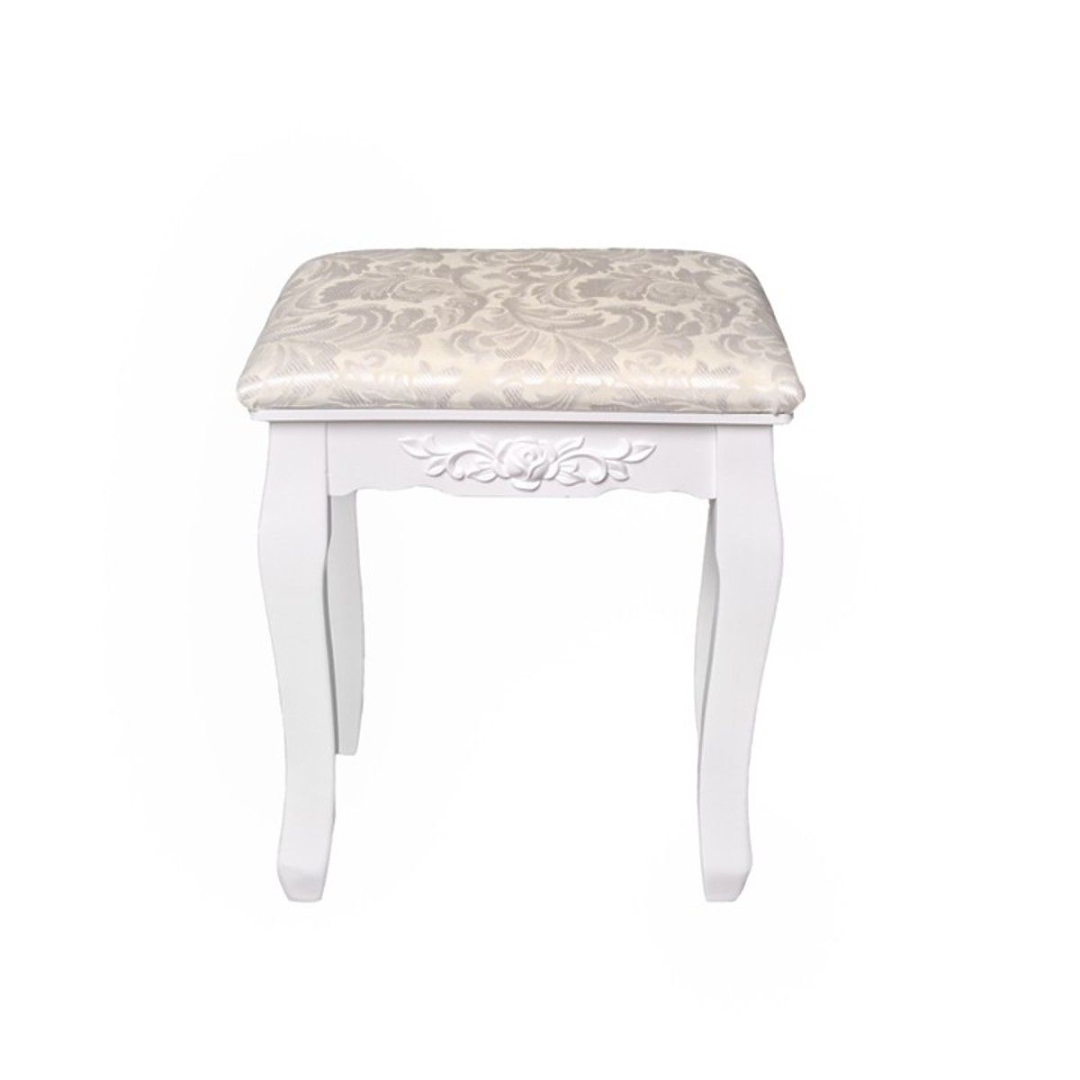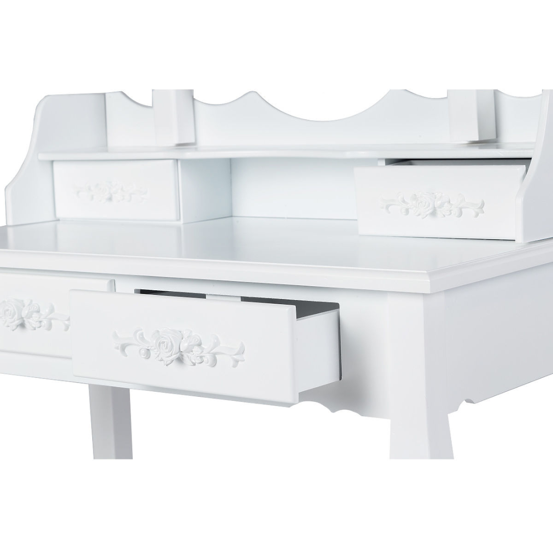 Elegantna bela miza z ogledalom, udobnim stolom in praktično shrambo za vsak kotiček vašega doma.