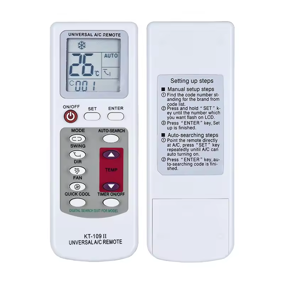Univerzalni daljinski upravljalnik za klimatske naprave podpira več kot 1000 različnih znamk klimatskih naprav. Je zelo enostaven za uporabo in uporablja baterijske kartuše AAA (ki niso vključene v embalažo). Opremljen je z LCD zaslonom z uro in temperaturo.