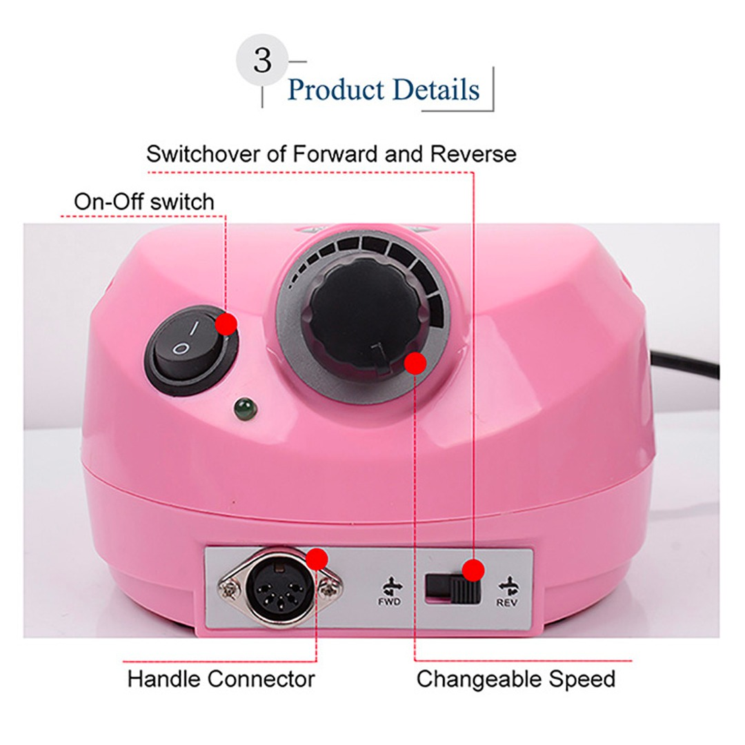 - Ta vrtalnik za nohte je izdelan iz močnega, a tihega motorja s pametnim odvajanjem toplote, pri uporabi stroja naj bo nizka vročina, nizek hrup in nizke vibracije.