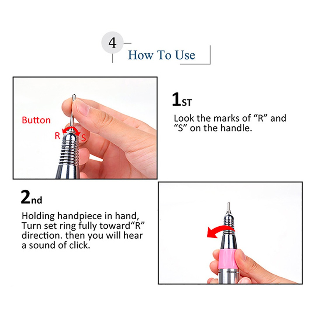 - ta vrtalnik za nohte se lahko uporablja za celovito oblikovanje, poliranje, brušenje, poliranje, odstranjevanje akrilnih nohtov, poligeliranih nohtov, debelih nohtov, praška za potapljanje, umetnih nohtov, naravni nohti in mrtva koža ounkta.